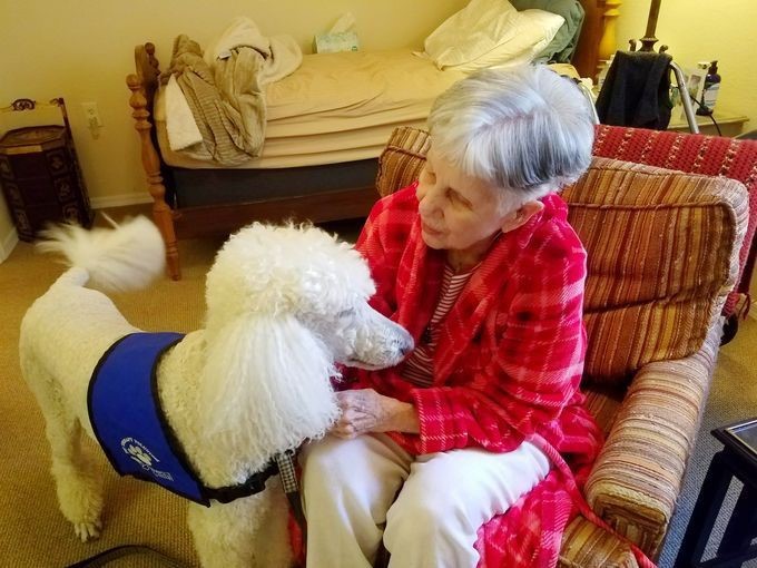 At first, it may feel strange, but just follow your furry companion. No matter how someone looks, sounds or smells, dogs accept them unconditionally. Pooches are unfailingly cheerful, eager to please, content to just share the space beside you. All invaluable traits when it comes to brightening someone’s day — someone who may no longer have human visitors.