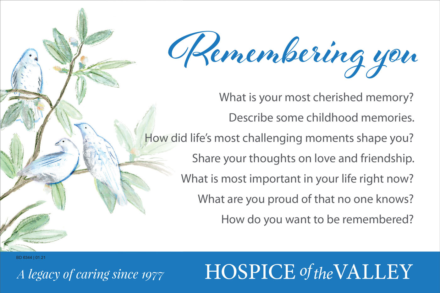 It can be very meaningful for your loved one to talk about their memories, dreams and passions in life. Use the questions below or think up some of your own. If you’d like a personal copy of the Legacy Card below, contact Merlinda Dominguez at mdominguez@hov.org and we’ll mail it to you.
